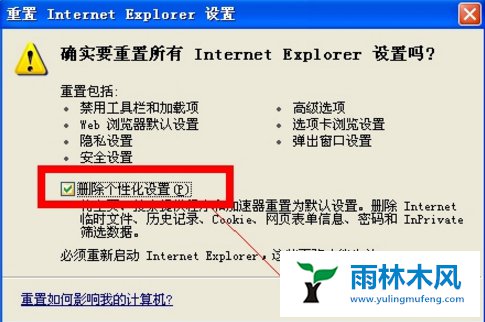 2、勾选删除个性化设置,最后重置即可,如下图所示