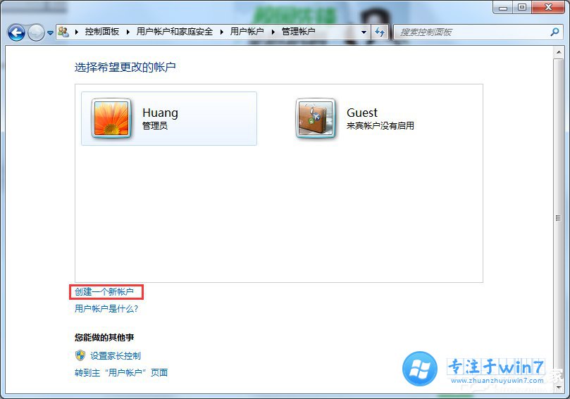 1、进入控制面板,找到并进入用户帐户和家庭安全,选择用户帐户,再进入管理帐户。